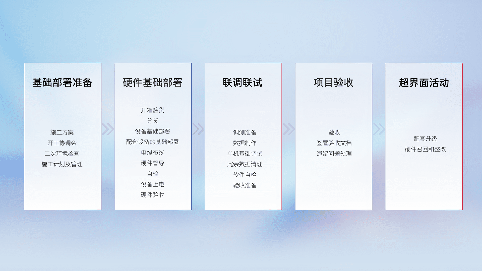 从基础部署准备、、硬件基础部署、、联调联试、、、、项目验收、、、越界面活动的全过程可追溯,,保证施工质量和进度。。